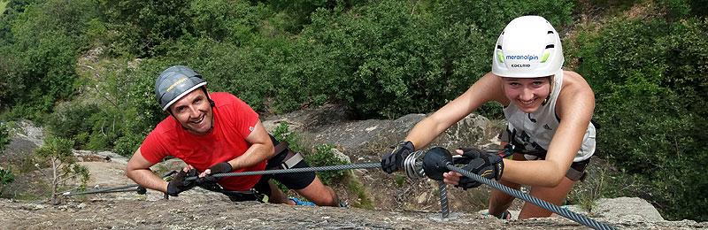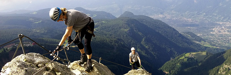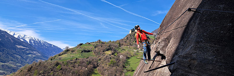 Der sehr anspruchsvolle Klettersteig am Naturnser Sonnenberg mit ausgesetzten Querungen, steilen Platten und einer langen Seilbrücke.